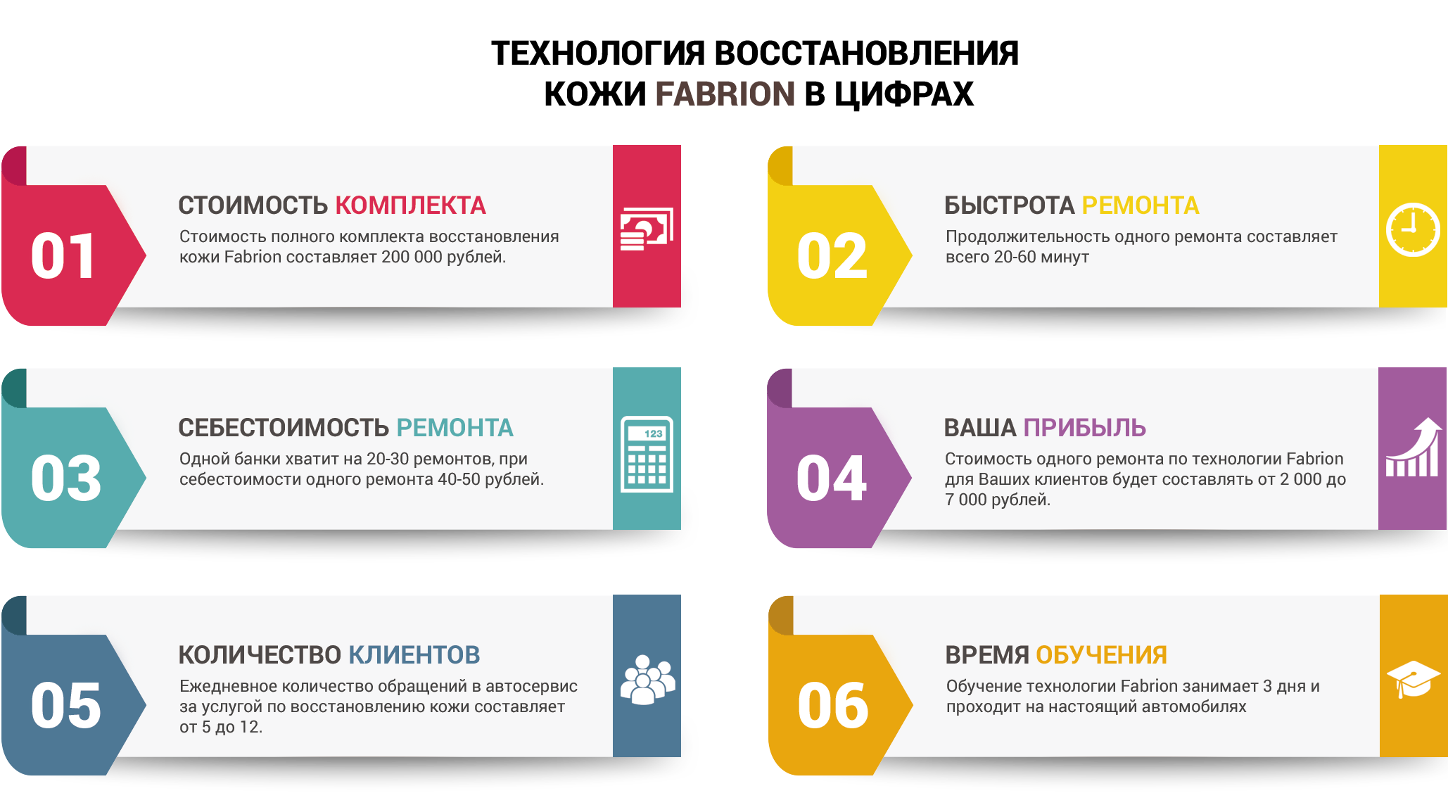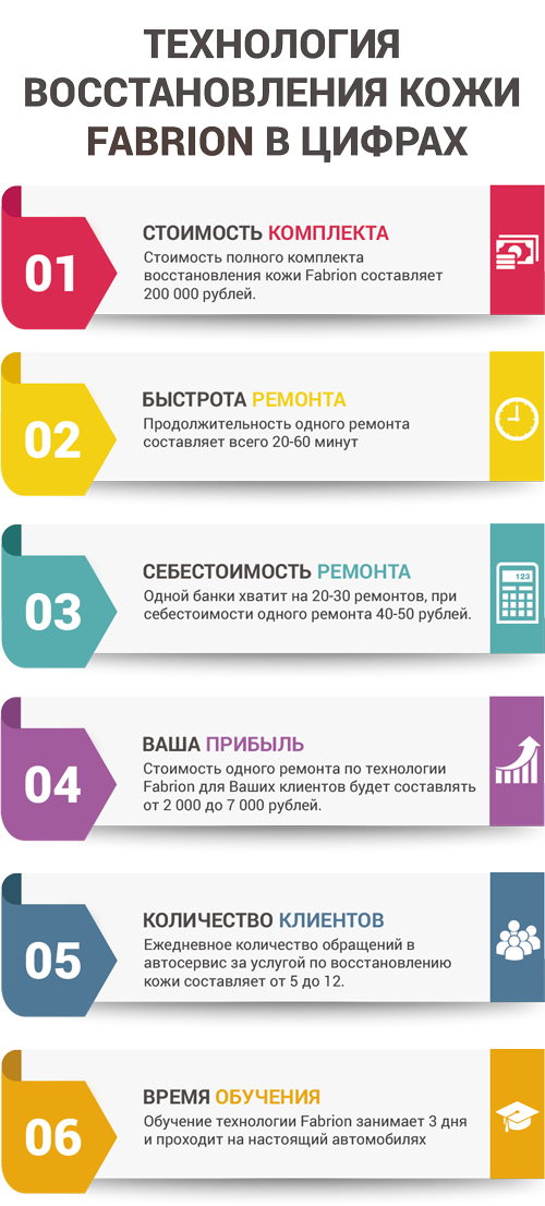 Уникальная система реставрации гарантирует идеальное соответствие оригинальному заводскому цвету салона, Вы никогда не увидите следов ремонта, и не ощутите их наощупь, а высокое качество ремонта салона обеспечивается запатентованными материалами Fabrion и специалистами которые прошли обучение в США.